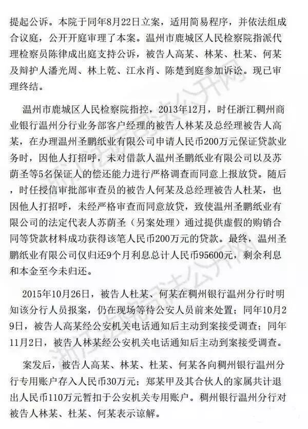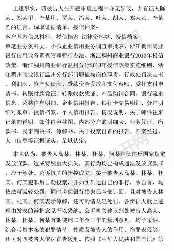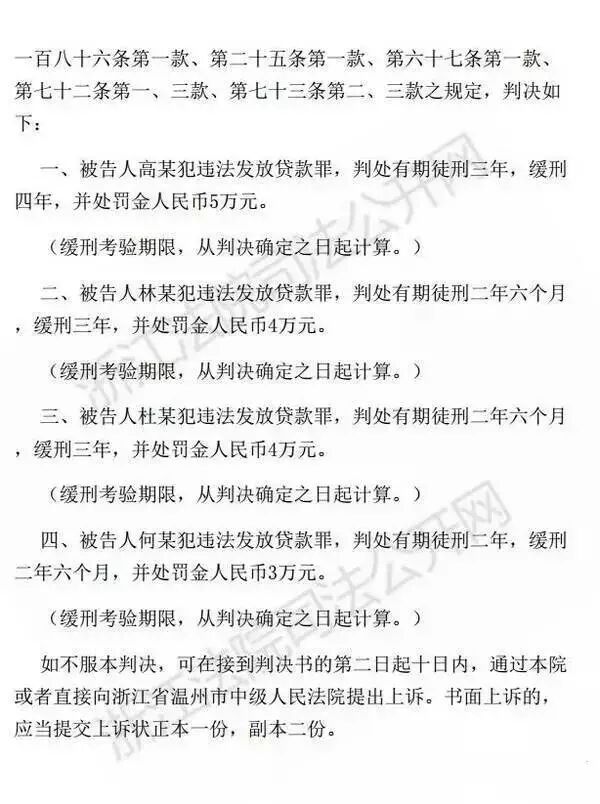 根据法院的判决,该案的稠州商业银行温州分行原业务部总经理高某被判有期徒刑3年、缓刑4年,并处罚金5万元;原业务部客户经理林某被判有期徒刑2年6个月、缓刑3年,并处罚金4万元;原授信审批部总经理杜某被判有期徒刑2年6个月、缓刑3年,并处罚金4万元;原授信审批部审查员何某被判有期徒刑2年、缓刑2年6个月,并处罚金3万元。四人罪名皆是“违法发放贷款罪”。