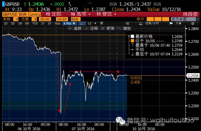 北京时间10月7日7时许,英镑对美元毫无征兆地大幅跳水,短短两分钟内跌幅超过10%,创下英国退欧公投以来的最大盘中跌幅,流动性瞬间大幅蒸发。