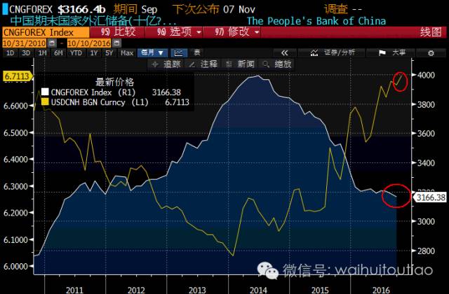 一方面,人民币已成功纳入SDR货币篮子,此前支撑人民币汇率稳定的动力已不足。另一方面,最新发布的外汇储备显示,我国外汇储备规模已连续3个月下降,9月末环比减少188亿美元,跌幅超预期,外储规模跌至2011年5月以来的最低水平。