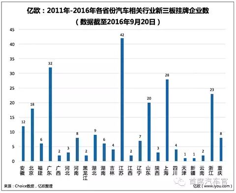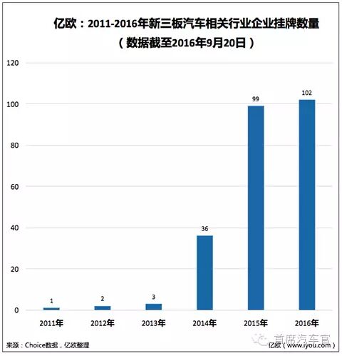 2014年挂牌新三板的汽车相关行业企业仅有36家,而2015年挂牌数量有99家,一年时间增长了1.5倍。2016年1月至9月20日,挂牌企业达到了102家。新三板挂牌的企业总数也直奔1万家而去,这一数量也远远超过了现A股上市公司的总数。