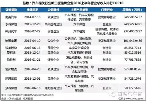 另外,前10家总营收排行中有4家都是汽车相关批发与零售业的公司。截至2016年9月20日,243家汽车相关行业新三板挂牌的企业中,仅有16家挂牌企业属于批发与零售行业。在整个产业线中,汽车及零部件在零售与批发环节的利润空间开始被压缩,这一变化或因当下新车利润率低、产能过剩等造成。