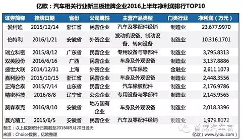 数据统计,243家挂牌新三板的汽车相关行业公司中,有184家公司为制造业,占比超过70%。在2016上半年净利润前10名排行中,有9家公司都属于制造业,并且净利润最高为2.4亿元。如此前所述,制造业之所以净利润与总营收优于其他行业,因其处于产业链的上端,有一定的话语权,并掌握了下游的资源,利润空间也是最大的。
