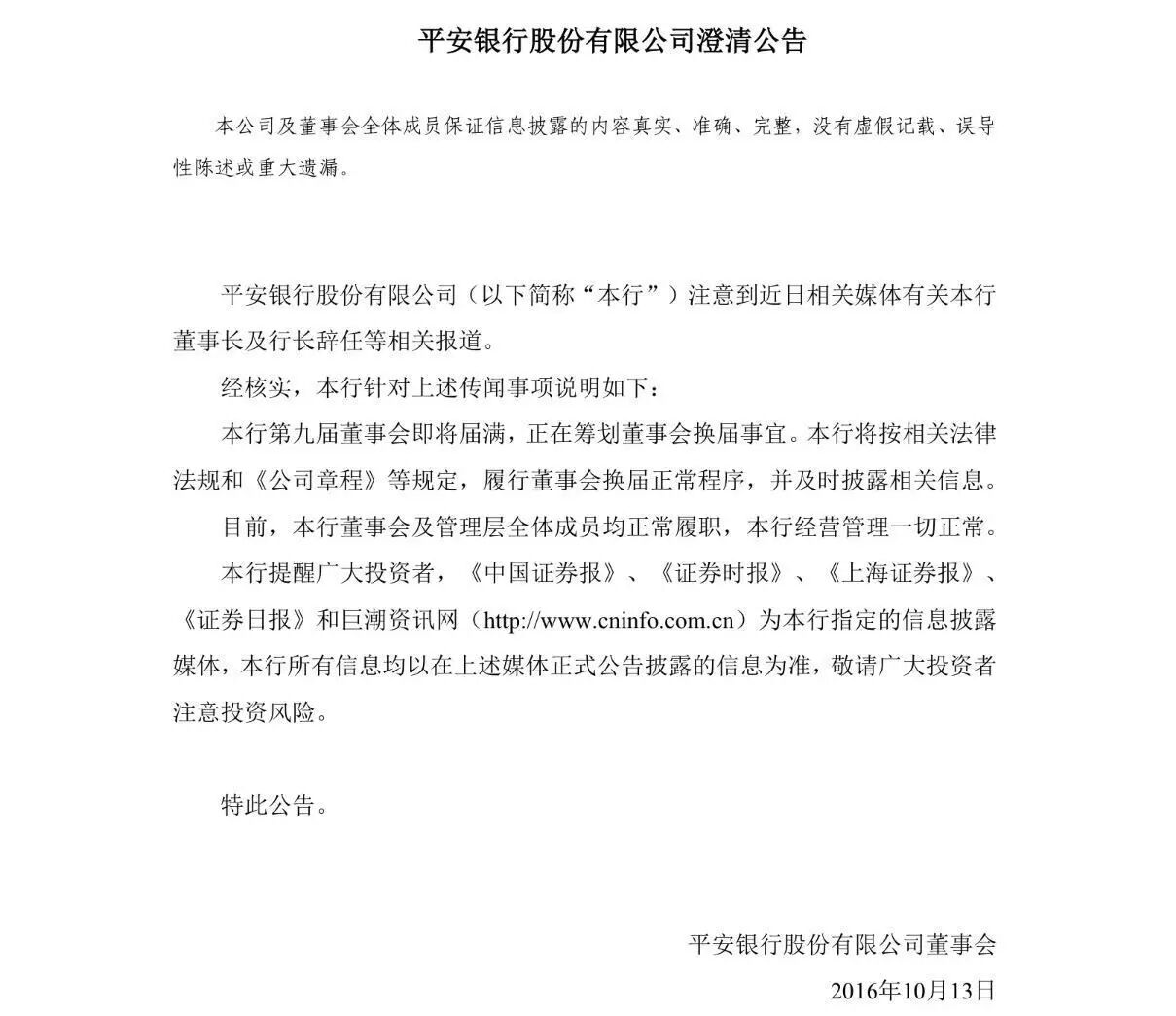 事情的最新进展是,平安银行发布澄清公告。针对相关报道和传闻,平安银行13日早间发布公告称:第九届董事会即将届满,正在筹划董事会换届事宜,目前董事会及管理层全体成员均正常履职。