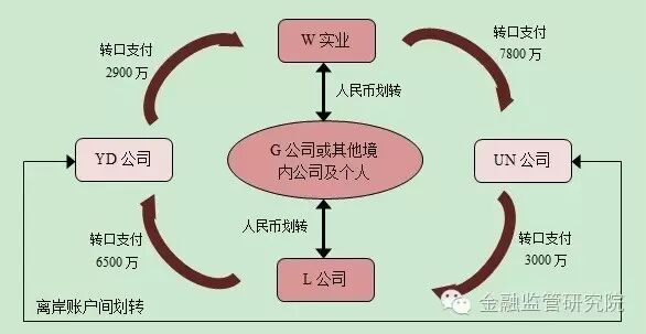 L公司以转口贸易方式大量向W投资公司的境外投资公司YD付汇,又从自身投资的UF公司中收汇。而W实业公司则大量向L公司境外投资公司UF付汇,又从W投资公司的境外投资YD公司中收汇。大量资金在关联公司之间按照L公司-YD-W实业公司-UF公司-L公司这一闭环路径流动,但各环节金额并不相等,资金流动最终结果表现为境内公司以90份虚假提单实现资金净流出8700万美元(见下图)。此外在调查中发现,L公司和W投资公司成立不足一年即在境外实施并购行为,中方境外投资总额分别是境内注册资本的9倍和15倍,且均未在发改委办理境外投资备案。