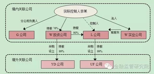 L公司、W公司、G公司、W投资公司等四家境内公司,以及YD公司UF公司两家离岸公司,六家公司间存在关联关系。
