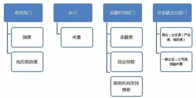 从发行主体看,债券分为政府部门、央行、金融机构与非金融企业部门四个,政府发行国债、地方政府债;央行发行央票;金融机构发行金融债券、同业存单与政府机构支持债券;非金融机构发行企业债与公司债。