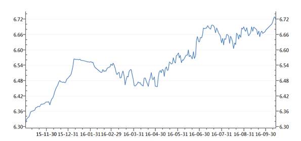 人民币兑美元中间价从国庆至17日累计下跌733点。