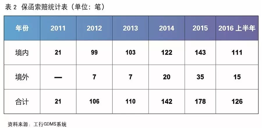 当前全球低迷的经济形势激发了市场主体的风险规避意识,放大了保函业务的市场需求,同时,也带来了保函索赔和保函纠纷的增长。近年来,工程保函、船舶保函领域的纠纷频出,给商业银行、承包商、船厂以及贸易商带来了新的挑战。保函索赔笔数也逐年增长,以工商银行的索赔统计为例(见表2),2012年和2015年收到索赔的笔数都有大幅增长,2016年形势更加严峻。商业银行需要关注保函索赔及纠纷,提升处理索赔及纠纷的专业能力。