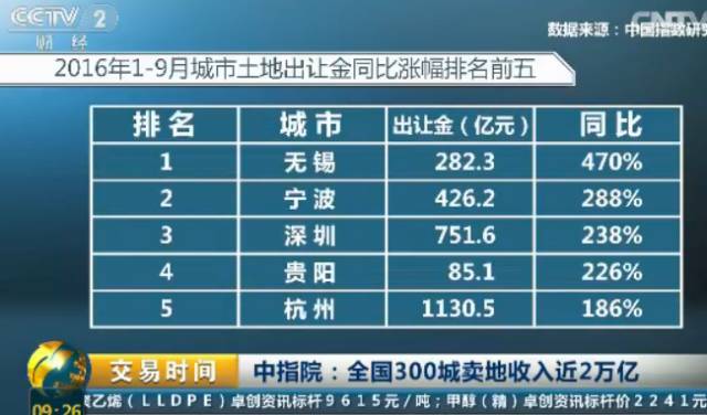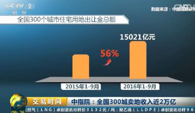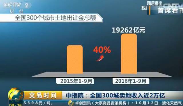 数据显示,2016年1-9月,全国300个城市土地出让金总额为19262亿元,同比增加40%。