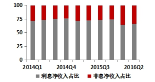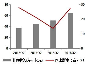 综合化经营持续推进、企业及个人多元化资产管理需求的不断提升等将成为推动非利息收入增长的有利因素,但外贸持续低迷、理财监管趋严、资本市场波动等影响因素不容忽视,预计年内非利息收入增速有所放缓,但占营业收入的比重预计可达32%左右,比2015年提高约6个百分点。