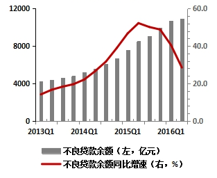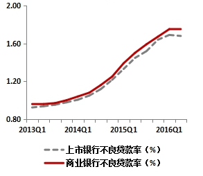 截至6月末,上市银行不良贷款余额同比增长28.5%,增幅较2015年同期下降23.7个百分点;不良贷款率同比上升0.23个百分点,增幅较2015年同期下降0.17个百分点(图3)。