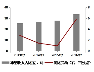 二是非息收入的贡献度显著提升。上半年,上市银行非息收入同比增长27.2%,增速同比提高13.6个百分点,非息收入占营业收入的比重由2015年同期的27.9%提高到33.7%(图2),较大程度上抵补了利息净收入的下滑。