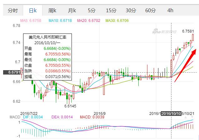 国庆节后,人民币兑美元不断走低,连续刷新6年新低:10日,人民币中间价跌破6.70;11日,人民币中间价逼近6.71;12日,人民币中间价跌破6.72;13日,人民币中间价逼近6.73,17日,人民币中间价逼近6.74关口。