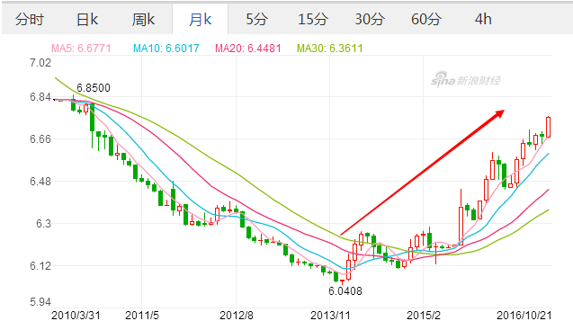 如果放在更长维度的月线来观察的话,人民币贬值更为明显: