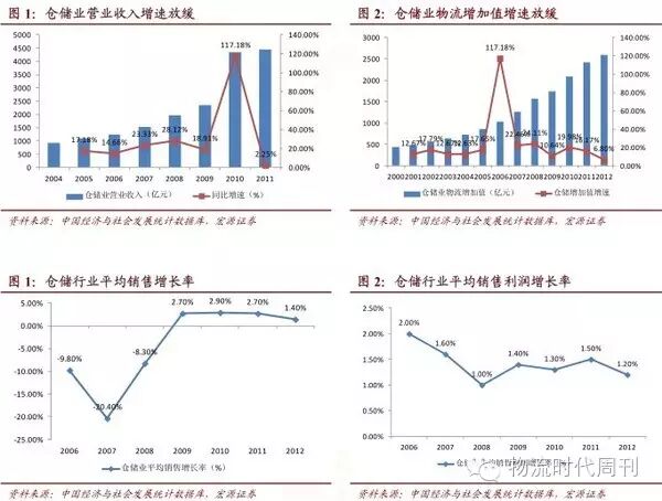 根据中国物资储运协会对67个大型仓储企业的调查,2012年企业实现主营业务收入318亿元,比上年增长10.5%;货物吞吐量7127万吨,比上年下降14%;利润总额比上年下降35.5%。亏损企业9家,亏损比例达14.4%。仓储行业上市公司的平均收入利润和盈利能力也在2012年有明显的下滑。