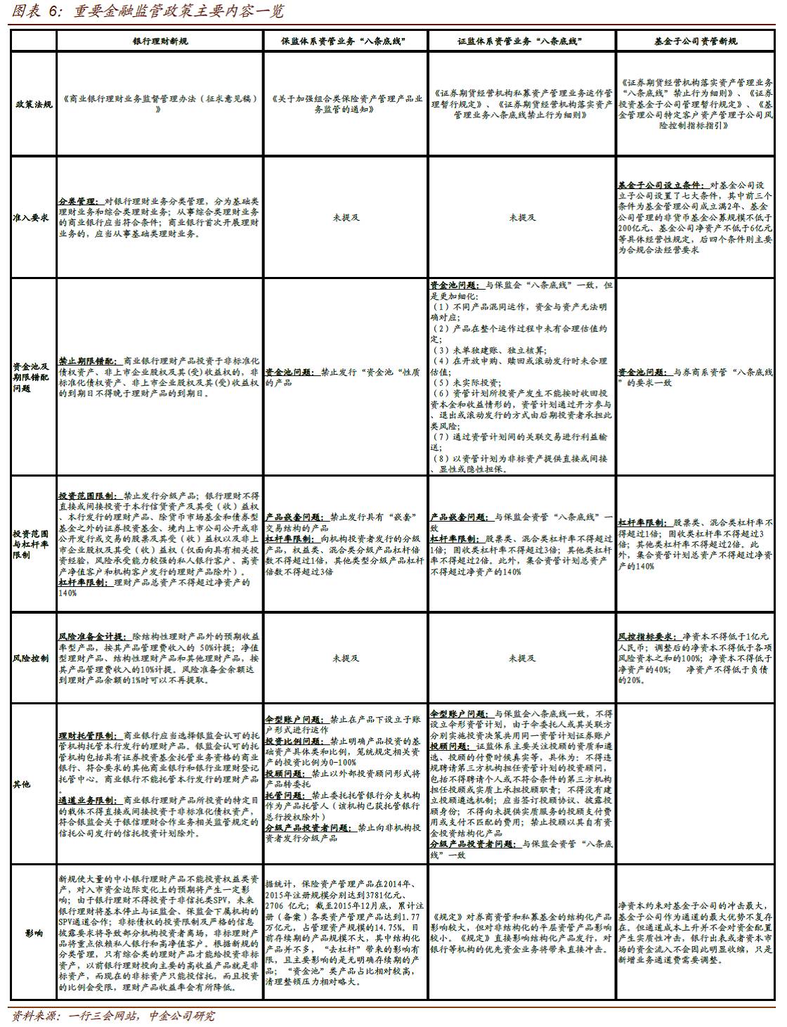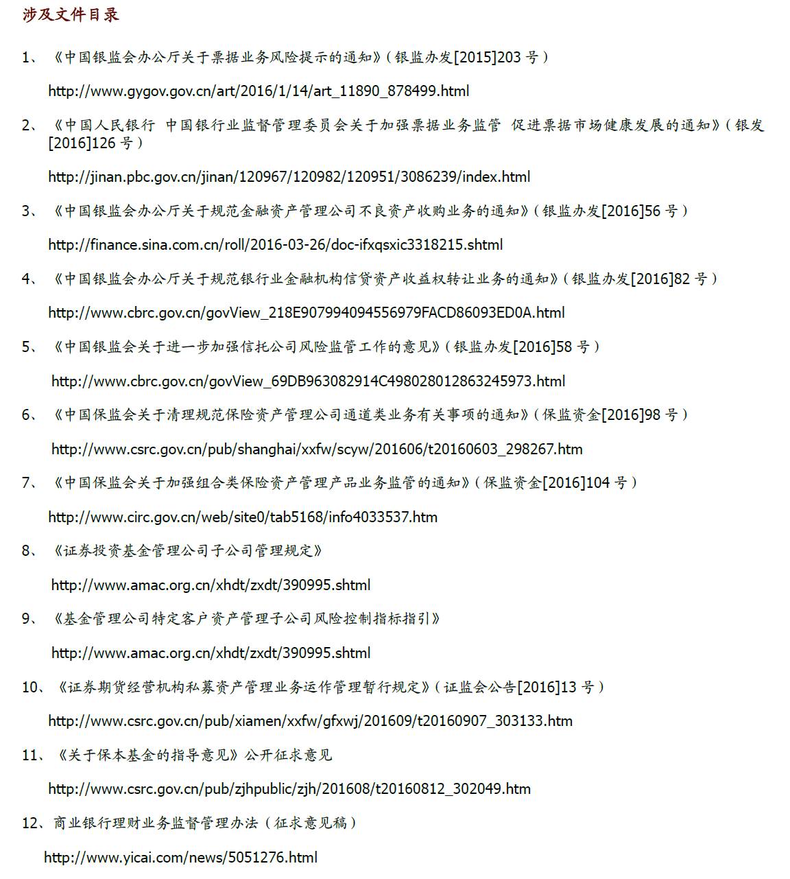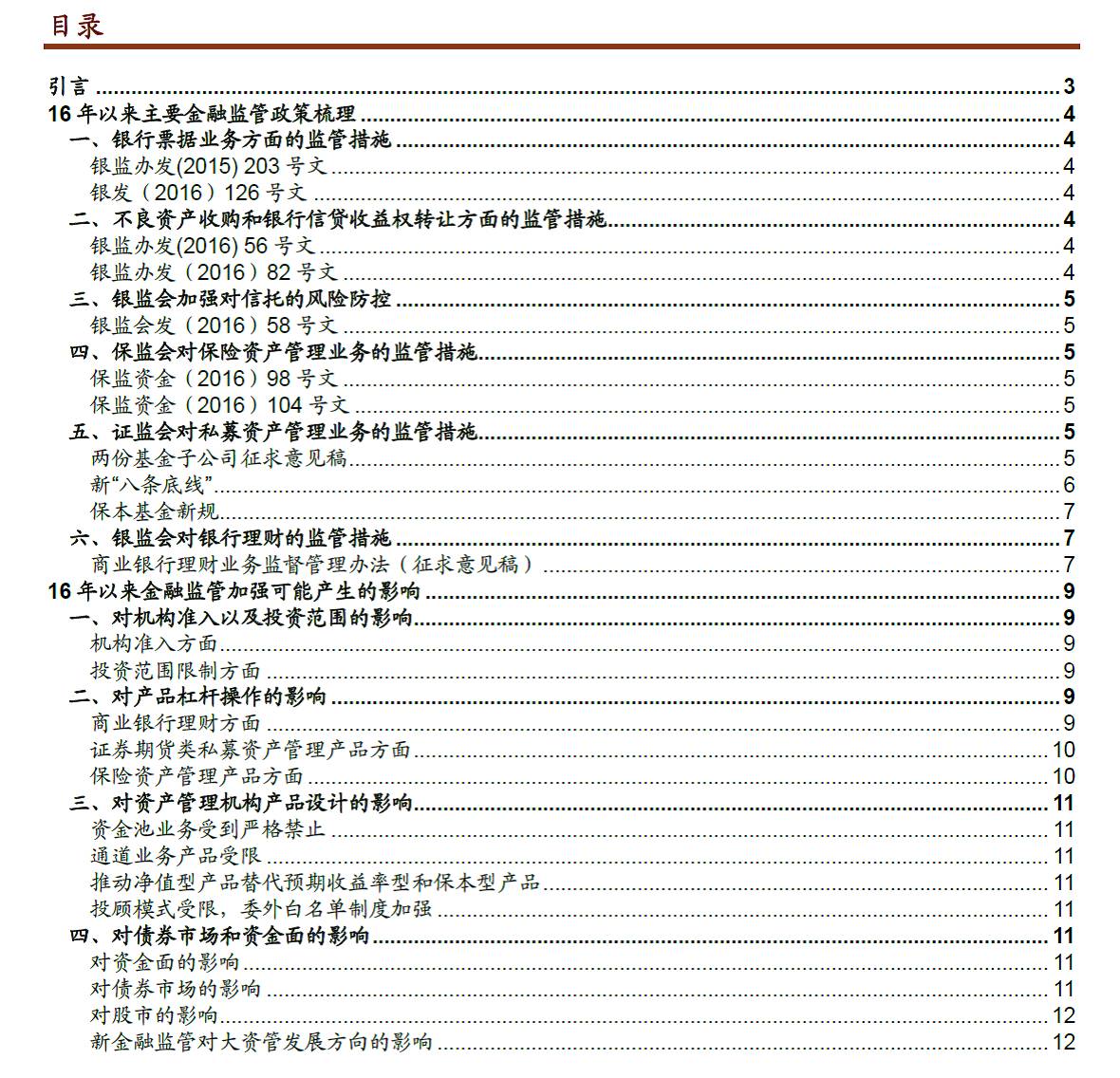 2016年金融监管政策梳理及影响分析 2016-10-24 22:21 905 作者王志飞分析员,SAC执业证书编号:S0080512060002;SFCCE Ref: BFL103姬江帆分析员,SAC执业证书编号:S0080511030008;SFC CE Ref: BDF391张继强分析员,SAC执业证 作者王志飞分析员,SAC执业证书编号:S0080512060002;SFCCE Ref: BFL103姬江帆分析员,SAC执业证书编号:S0080511030008;SFC CE Ref: BDF391张继强分析员,SAC执业证书编号:S0080511030010;SFC CE Ref: AMB145陈健恒分析员,SAC执业证书编号:S0080511030011SFC CE Ref: BBM22来源:中金固定收益研究(ID:FICC_CICC)引言2012年起伴随金融脱媒化,以银行理财为代表的大资管类投资者在信用债持有者结构中的占比越来越高,目前已经过半。去年8月末,商业银行与广义基金对存量银行间信用债的持仓占比分别为39%和37%,虽在伯仲之间,但商业银行(自营)仍是信用债最大持有者。自15年四季度开始,广义基金持仓占比开始超过商业银行,成为信用债最主要的投资者群体。截至16年9月末的最新数据,广义基金和商业银行的持仓占比分别为53%和24%。(图表1,由于公司债不披露持有者结构,上述数据未包含公司债。不过由于商业银行较少直接参与交易所市场,如果考虑公司债的话,大资管投资者的市场占有率还会更高。)信用债投资者结构的变化伴随着需求群体风险偏好中枢的明显提高,这是过去两三年来信用利差和持续降低并在历史低位长期维持的重要原因之一。我们在14年9月22日发布的专题报告《有中国特色信用利差的历史与未来》中分析过,导致中国信用利差持续偏低的主要因素有两个:一是刚兑环境、违约稀少,市场无需在信用债定价中反映风险溢价。二是脱媒化背景下各类理财资金成为信用债投资群体的绝对主力,这类群体风险偏好和收益率要求明显高于银行自营,又没有资本消耗限制,会更加倾向于信用下沉获得相对较高的利差,从而推动评级间利差不断压缩。16年以来理财规模增速放缓,风险偏好也有回落迹象,未来以理财为代表的广义基金对信用债需求的边际变化将显著影响信用利差中枢水平的变化。16年以来银行理财规模维持增长,但增速放缓明显放缓。虽然经济的低迷和其他高收益资产的欠缺使得理财规模很快出现负增长的可能性不大,但理财本身缺资产的情况也在日趋严重。资产端收益率下行倒逼理财成本不断下降,与货币基金和活期存款相比优势逐步缩小,会进一步导致理财规模扩张的难度加大。尤其在信用债券违约风险未降低及金融杠杆监管趋严的过程中,银行理财的风险偏好和杠杆率水平存在趋于下降的压力。在目前过低的信用利差水平下,中长期来看需要对理财规模增长边际放缓,甚至极端情况下的阶段性收缩和去杠杆对信用债可能产生的负面影响保有一份警惕。虽然由于流动性错配和竞争同质性特征的存在,理财本身很难实现主动的规模收缩和去杠杆。但16年以来监管层关于金融去杠杆的政策层出不穷,最终会加大理财提升收益的难度,从而可能使得理财规模增长难度进一步加大,去杠杆的速度也可能加快。由于理财在期限和流动性上显著错配,天然具有规模只能增不能减的刚性特征。再加上不同银行理财同质性特征很强,竞争过程中容易陷入囚徒困境,因此如不出现显著的外力因素压制,理财本身很难实现主动的规模收缩和去杠杆。但需要注意的是进入2016年之后,监管机构对金融风险的关注度越来越多。其背景主要是2014年以来大资管兴起,银行理财、券商资管、基金专户和子公司管理规模爆发式增长(图表2)。尤其是去年6月份“股灾”之后,高收益资产越来越稀缺,期限错配、资金池、加杠杆以及产品嵌套等现象在泛资管领域非常普遍,加剧了金融风险的传染性以及系统脆弱性。为了防范相关风险,防止资金脱实向虚,2016年以来一行三会统一行动,对票据、信贷资产收益权、保险资管、券商资管、基金子公司以及银行理财出台了多项监管政策。由于监管文件数量众多,内容繁杂。本文试图详细梳理各项监管政策的条款,并分析各项政策对债市相关领域的影响,希望对投资者开展债券投资提供一定的帮助。16年以来的主要金融监管政策梳理一、银行票据业务方面的监管措施银监办发(2015) 203号文2015年12月31日,银监会《中国银监会办公厅关于票据业务风险提示的通知》(银监办发[2015]203号)出台,此文是银监会对2015年上半年部署的对票据业务现场检查成果的总结,“203号文”主要列举了七大违规问题,包括票据同业业务专营治理落实不到位;通过票据转贴现业务转移规模,消减资本占用;利用承兑贴现业务虚增存贷款规模;与票据中介联手,违规交易;贷款与贴现相互腾挪,掩盖信用风险;创新“票据代理”规避监管要求;部分农村金融机构为他行隐匿;消减信贷规模提供“通道”,违规经营问题突出。203文同时还指出了两项禁止事项,包括不得办理无真实贸易背景的票据业务以及机构和员工不得参与各类票据中介和资金掮客活动,严禁携带凭证、印章等到异地办理票据业务。银发(2016)126号文2016年4月27日,由中国人民银行和银监会共同发布了《关于加强票据业务监管促进票据市场健康发展的通知》(简称126号文),这算是为半年以来不断爆发的票据风险事件做了一个官方的定性。通知要求,严格贸易背景真实性审查,严格规范同业账户管理,有效防范和控制票据业务风险,促进票据市场健康有序发展,银行应于6月30