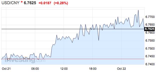 10月13日,人民币对美元中间价报6.7296,连续第7天下调,较前日夜盘跌96点,美元指数则在各种利好之下气势如虹,一度突破了98;10月21日,人民币中间价下调247个基点,报6.7558,刷新逾六年新低,亦为8月29日以来最大调降幅度。当日9:52,在岸人民币跌破6.75大关,此后险守6.76关口,也离近期市场热议的“6.8铁底”更近了一步。
