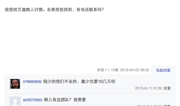 在各大催债论坛上,都能看到雇主四处询问:“哪里可以联系上艾滋病催债队?”也有艾滋病人自己在论坛和群里揽活。