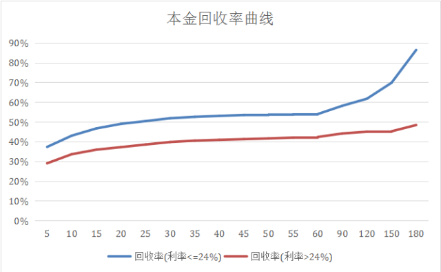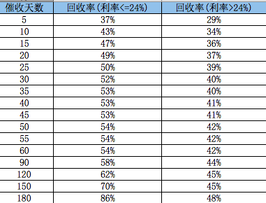 某催收团队提供的催收回收率显示,利率低于24%的贷款,180天的催收周期,最高可高达86%;而利率高于24%的贷款,180天催收周期,最高可达48%。