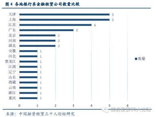 与其他类型租赁公司类似,天津、上海、广东、北京同样是银行系金租公司的聚集地。北、上、广、天津四地拥有银行系金租公司15家,占银行系总数的45%。另外,江苏省有四家,在数量上同样位居前列。