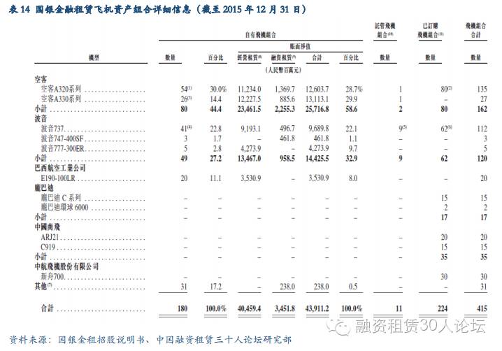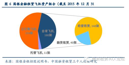 同样是飞机租赁巨头的国银金租,截至2015年12月31日,其自有飞机组合租赁资产总值为439亿元人民币。飞机组合共有215架飞机,由180架自有飞机、11架托管飞机和224架已订购飞机组成。自有飞机中有140架用于经营租赁,40架用于融资租赁。其现有经营租赁机队平均机龄仅为4.5年。