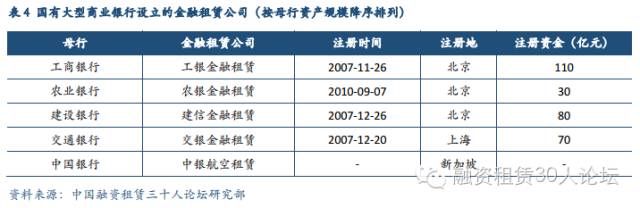 工农中建交五大行,除了中行外,其他四家均在中国境内注册成立了金融租赁公司,分别为:工银金租、建信金租、交银金租和农银金租,平均注册资本金72.5亿元。(中行于2006年成功收购了亚洲领先的飞机租赁公司-新加坡飞机租赁有限责任公司,注册成立了中银航空租赁私人有限公司,总部设在新加坡)。