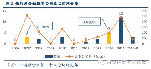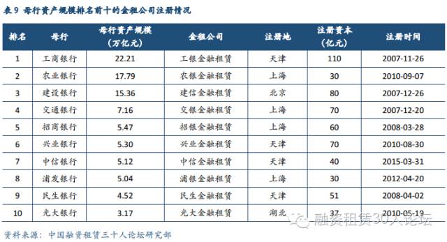 据中国融资租赁三十人论坛统计,截至2016年6月末,共计有49家金融租赁公司成立,其中,33家由银行主导发起设立(33家不包含由平安银行所在集团主导发起设立的平安国际融资租赁有限公司)。凭借母行强大的背景,银行系金融租赁公司成长为中国融资租赁业的主导力量。
