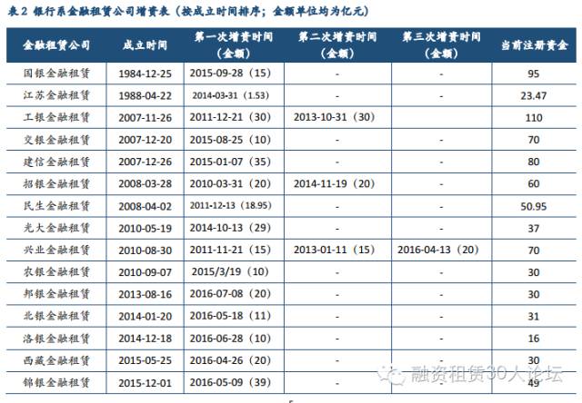 截至目前,33家银行系金租公司中,共计有15家实施了增资。其中,兴业金租分别在2011、2013、2016年完成三次增资;工银金租、建信金租、招银金租、光大金租、兴业金租、邦银金租、西藏金租、锦银金租等租赁公司单次增资规模超过20亿元。