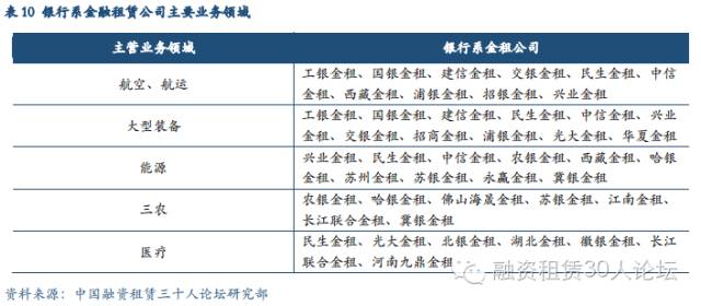 从主营业务领域看,银行系金租公司业务领域主要集中在飞机、船舶、大型装备、能源、医疗、三农等大资产。