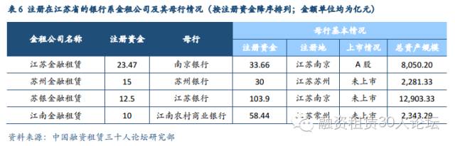 另外,虽然江苏省共拥有四家银行系金租公司,在数量上位居第二,但资本金总和仅有60.97亿元,排名第六,不及北京、广东甚至湖北等地区。其原因在于注册在江苏省的银行系金租公司,参股行均是江苏省当地的城市商业银行或农商行,其母行总资产规模相对不高。