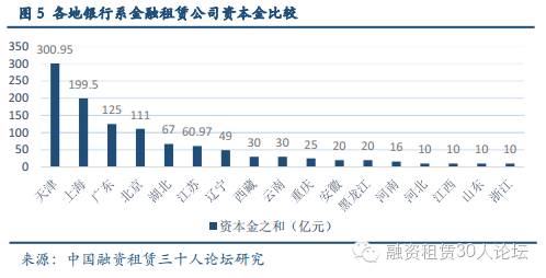 从资本金的角度看,北、上、广、天津四地的银行系资本金总和达736.45亿元,占全国银行系资本金总和的67%。其中,虽然天津与上海均拥有5家银行系金租公司,在数量上并列位居第一;但在资本金的层面上,天津的银行系金租公司资本金总和达300.95亿元,比上海地区高出101.45亿元。可见,相比起其他地区,天津无论从数量角度,还是资本金角度,都是名副其实的中国融资租赁聚集地。