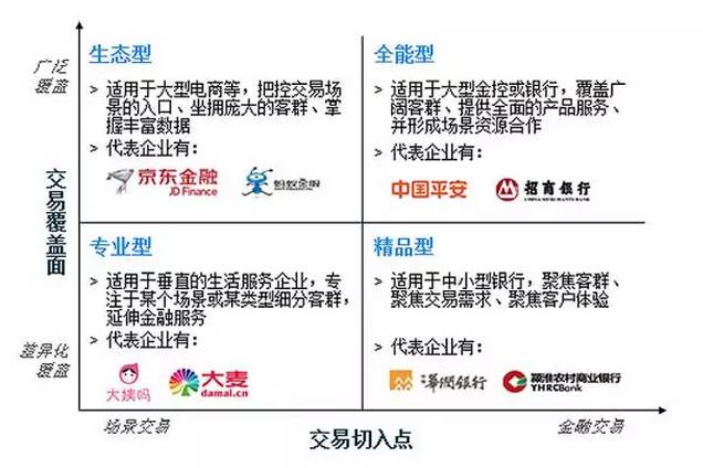 通过分析国内外领先实践,从交易覆盖面和交易切入点两个维度,互联网交易型银行已逐步形成全能型、精品型、生态型和专业型四种差异化模式。