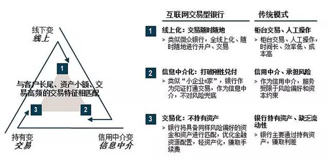 互联网交易型银行将从传统的线下模式、信用中介、资产持有转变为线上模式、信息中介、资产交易(流转)。