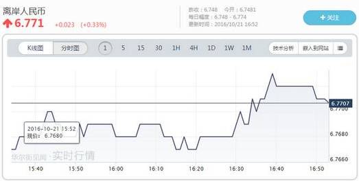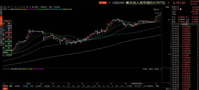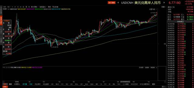 用技术分析的话说,这就是放量下跌。在纽约交易时段,离岸人民币兑美元再创六年新低,但未能突破6.75。今日中国外汇交易中心公告,人民币汇率中间价报6.7558贬值247点,刷新6年低位。写稿之时,USDCNH已经超过6.77,涨幅0.33%;USDCNY也已超过6.76,涨幅0.23%,如下图: