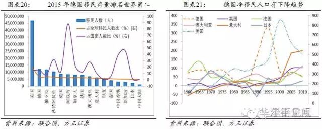 移民速度放缓,依靠移民来解决国内人口自然增长缺口也无法实现。欧洲一些发达国家均是移民的首选目标,德国1988-2000年人口增长的主要推动力就在于移民以及移民人口的高出生率,特别是1988-1996年因为两德统一放松移民限制,期间累计移民192万,后移民迁入人口不断下降、迁出人数却缓慢上升。移民人口主要分布在德国的大型城市,移民人口占比普遍在20%以上,如法兰克福25%、慕尼黑23%、奥芬巴赫31%。