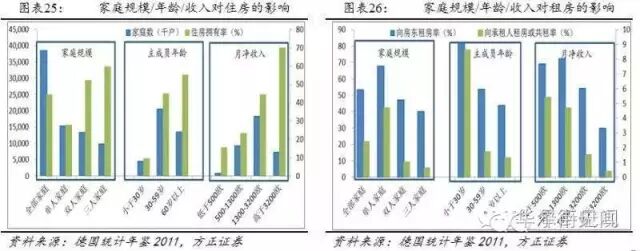 家庭小型化影响到人们的购房和租房选择。1)尽管家庭数量增加,但并未形成有效的住房需求。因为没有生活负担、不用考虑子女教育问题,单身家庭中72.3%的人会选择租房。2)大多数人30岁之后才考虑买房,老龄人口的住房拥有率最高。30岁以下的家庭住房拥有率不到10%。3)德国居民收入差距较大,中低收入家庭需申请住房补贴,住房拥有率较低。