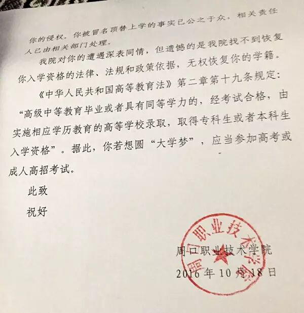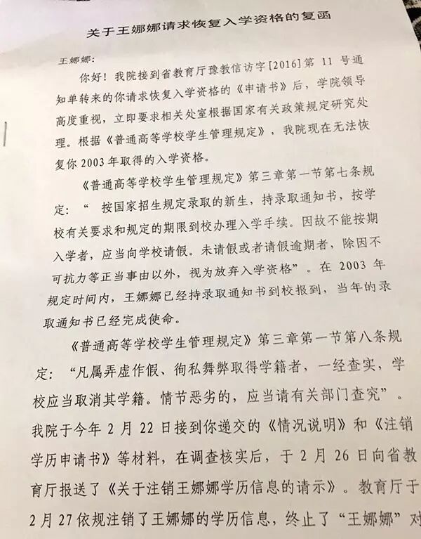10月18日,周口职业技术学校出具回函称:“在2003年规定时间内,王娜娜已经持录取通知书到校报到,当年录取通知书已经完成使命……你被冒名顶替上学的事实已公之于众,相关责任人已有相关部门处理……找不到恢复你入学资格的法律、法规和政策依据,无权恢复你的学籍。”