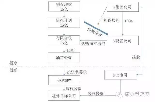 增信方式上,M集团公司的全资子公司与信托计划签署了回购协议,M集团公司为回购协议提供担保。银行理财实际上依托了M集团的信用来操作这个项目。提示一下,这个案例有很多变通的模式,可将境内资金运作至境外去对接各类标的资产。