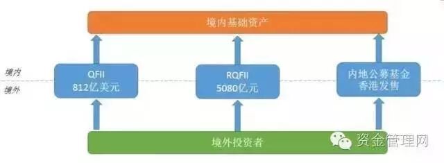 下面我主要讲一下QFII和RQFII,他们的机理是一样的,但币种不同而已。QFII/RQFII可直接投资境内的公募基金/私募基金或专户,对接股票、债券、ABS、指数期货、各类权证,投资范围囊括了二级市场的所有品类。境外银行通过理财募集了的理财资金,能不能投资境内债券、基金?通过QFII/RQFII通道是可以实现的。