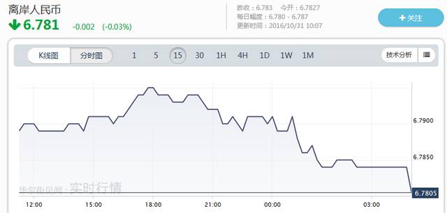 中间价公布后,在岸、离岸人民币双双走高。在岸人民币兑美元开盘报6.7702,上日收报6.7810。离岸人民币兑美元上涨至6.781,稍早最低报6.7908。上周公布的美国三季度GDP初值增长2.9%,创两年最快增速,美联储加息预期进一步强化。