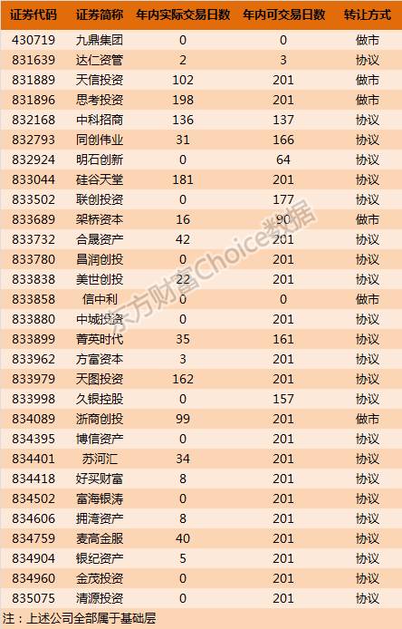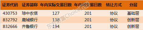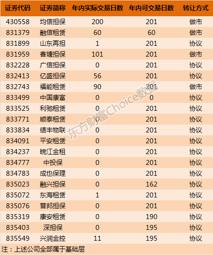 根据东方财富Choice数据统计,截至11月1日,新三板挂牌公司中属于金融概念的共计127家,其中银行3家,券商6家,期货5家,基金1家,保险相关13家,PE机构29家,小贷公司48家,担保租赁21家,典当公司1家。下面附上新三板金融概念全部挂牌公司名单及年内实际交易天数。