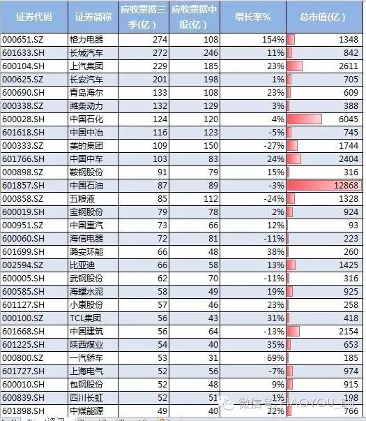 入围的企业150家,合计的应收票据达到6162亿,较2季度增加了600多亿,说明企业用票据支付的量在增加。其中增速最快的是格力电器,其应收票据增加了近170亿;应收票据超百亿的上市公司有10家。