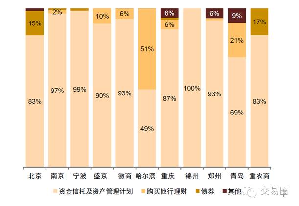 上图中“投资”类资产包括债券投资、应收款项投资等,是同业业务主流。应收款项类投资中包括信托公司信托计划、证券公司及保险、基金子公司资产管理计划及其他商业银行发行的理财产品的投资。从下图可以看出,除哈尔滨银行外,其他10家银行都以信托、资管计划投资为主流,只有缺少此类资产配置的银行才会以购买他行理财产品为补充。