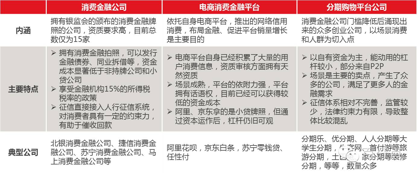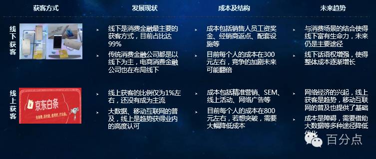 资金提供方式包括股东存款、同业拆借、ABS、P2P平台等,不同渠道的资金成本差异较大,ABS成为主流模式,P2P的资金成本最高; 消费金融服务公司社会更为熟知,包括拥有消费金融拍照的15家消费金融公司,依托自身平台的电商消费金融公司如蚂蚁金服、京东白条等,以及数量众多依托场景的公司,如校园分期、旅游分期等,三种类型的公司在资质、客户、征信手段等方面存在较大差异; 消费者方面,线下仍是目前的主流,目前占比达到99%,线上是未来的趋势,但目前的成本较高。