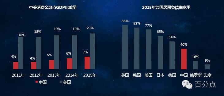 调查分析,2015年中国消费金融占GDP的比重为7%,居民负债率水平也比较低,对比美国情况来看,国内随着消费升级和人们消费理念的改变,消费金融的蓝海依旧,存在较大的可拓展空间。