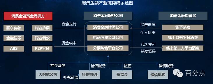 通过调研分析发现,目前消费金融已经形成了成熟的产业链,主要由资金提供方、消费金融服务公司和消费者三部分构成: