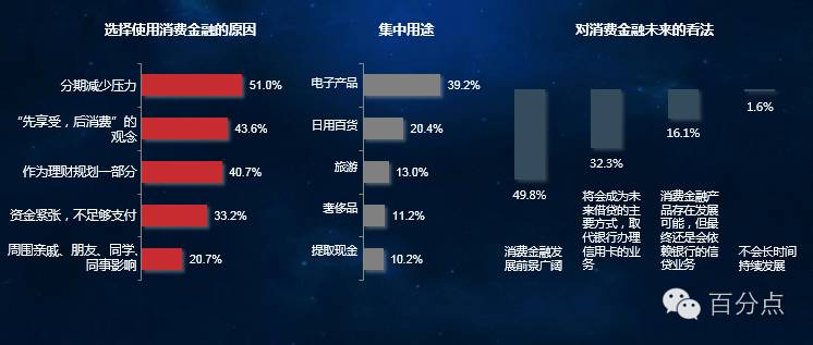 使用消费金融的主要原因集中在分期减少压力以及受先享受后消费的观念,电子产品是主要的购买物品,在前景方面多数消费者看好消费金融的前景。