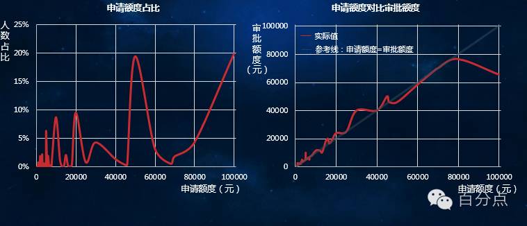 5K和100K分别是申请额度的两个高峰,100K的审批额度明显低于预期。