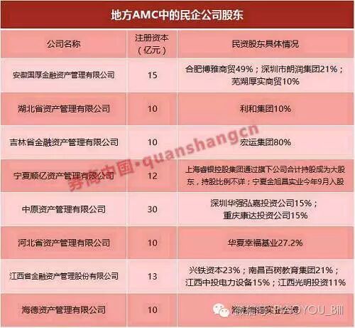最早出现在获银监会备案地方AMC的,是安徽国厚金融资产管理公司,作为第一批获银监会批复的省级AMC,该公司80%股权均由民资持股,其中合肥博雅商贸持股49%,为第一大股东。该公司今年6月将注册资本由10亿元增至15亿元。