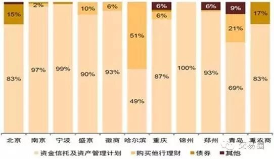 上图中“投资”类资产包括债券投资、应收款项投资等,是同业业务主流。应收款项类投资中包括信托公司信托计划、证券公司及保险、基金子公司资产管理计划及其他商业银行发行的理财产品的投资。从下图可以看出,除哈尔滨银行外,其他10家银行都以信托、资管计划投资为主流,只有缺少此类资产配置的银行才会以购买他行理财产品为补充。